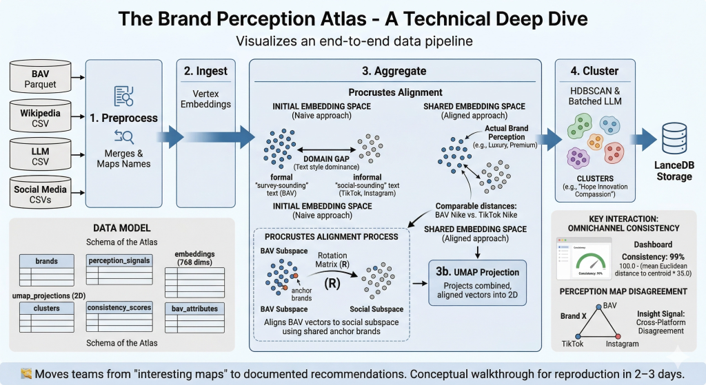 The Brand Perception Atlas was built to turn that noise into a map, designed to integrate diverse perception signals into a unified analytical framework. By combining social media data, public knowledge sources, Large Language Model (LLM) summaries, and established brand equity research, the Atlas aims to provide a more comprehensive understanding of how brands are perceived across the digital ecosystem.